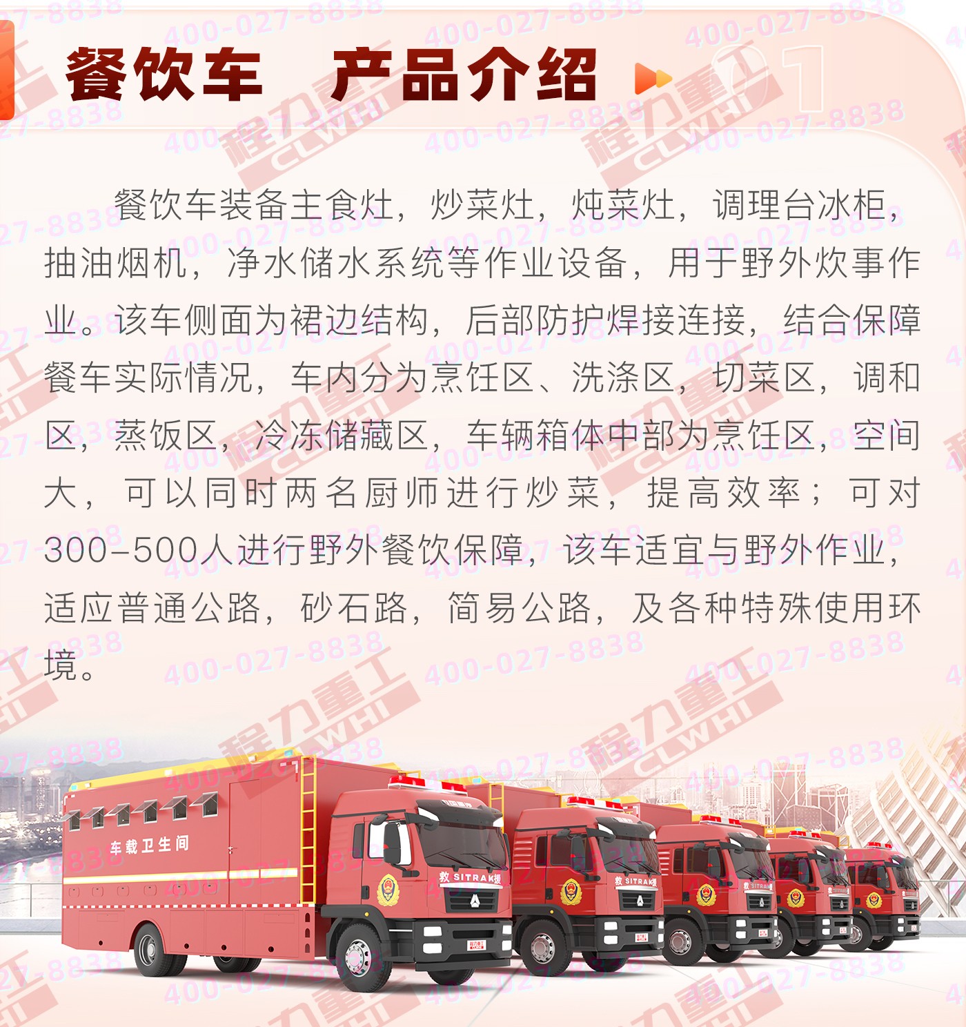 重汽HOWO炊事車:中國重型汽車集團(tuán)原廠重汽豪沃6*6越野底盤,三軸5200+1400mm軸距,9726ML排量,280馬力。