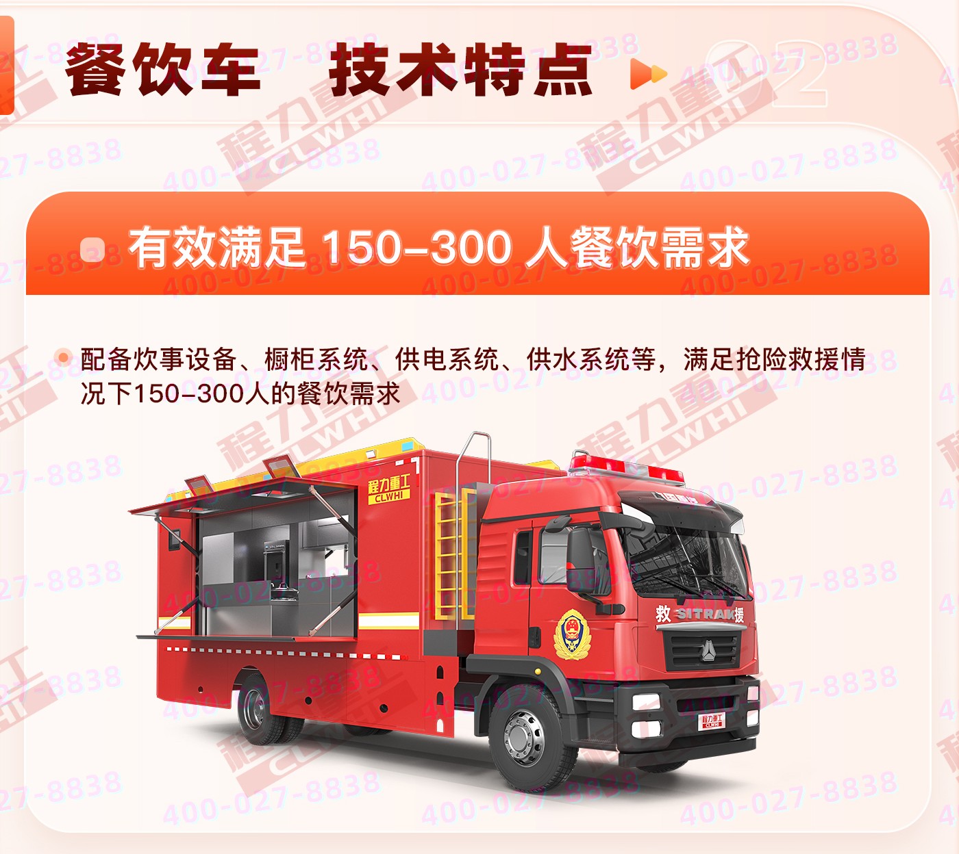 重汽汕德卡飲食保障車集爐、櫥、箱、案與一體,緊湊靈巧;實現了衛生、健康、環保的要求; 功能性等集合為一體。車廂可兩邊展開作為打餐窗口;車廂內飾為不銹鋼,配備不銹鋼爬梯、護欄、凈水箱,污水箱,雙眼灶,蒸飯車,冰箱等。不銹鋼整體壁柜,工作臺,發電機,空調等。該車機動性能好,專業性強,自動化程度高,自然環境適應性強,并能在駐車和行車時進行炊事作業,可保障執行野外任務部隊的飲食和飲水供應。