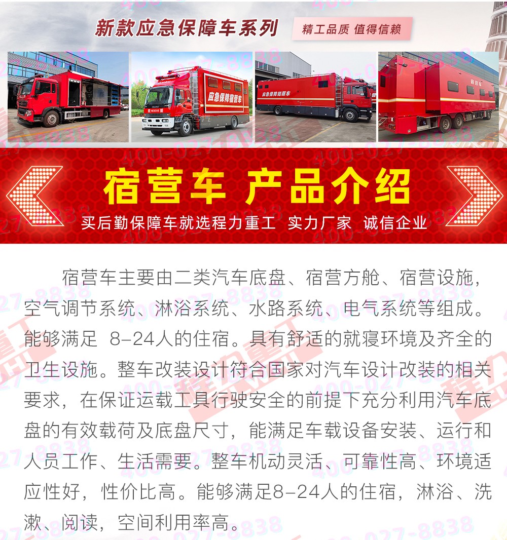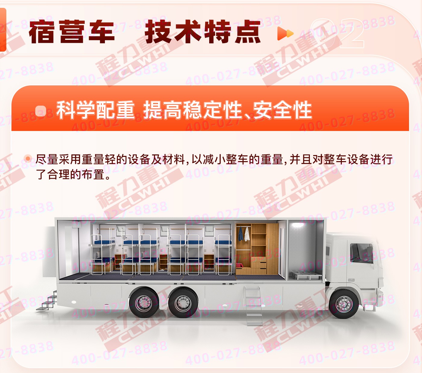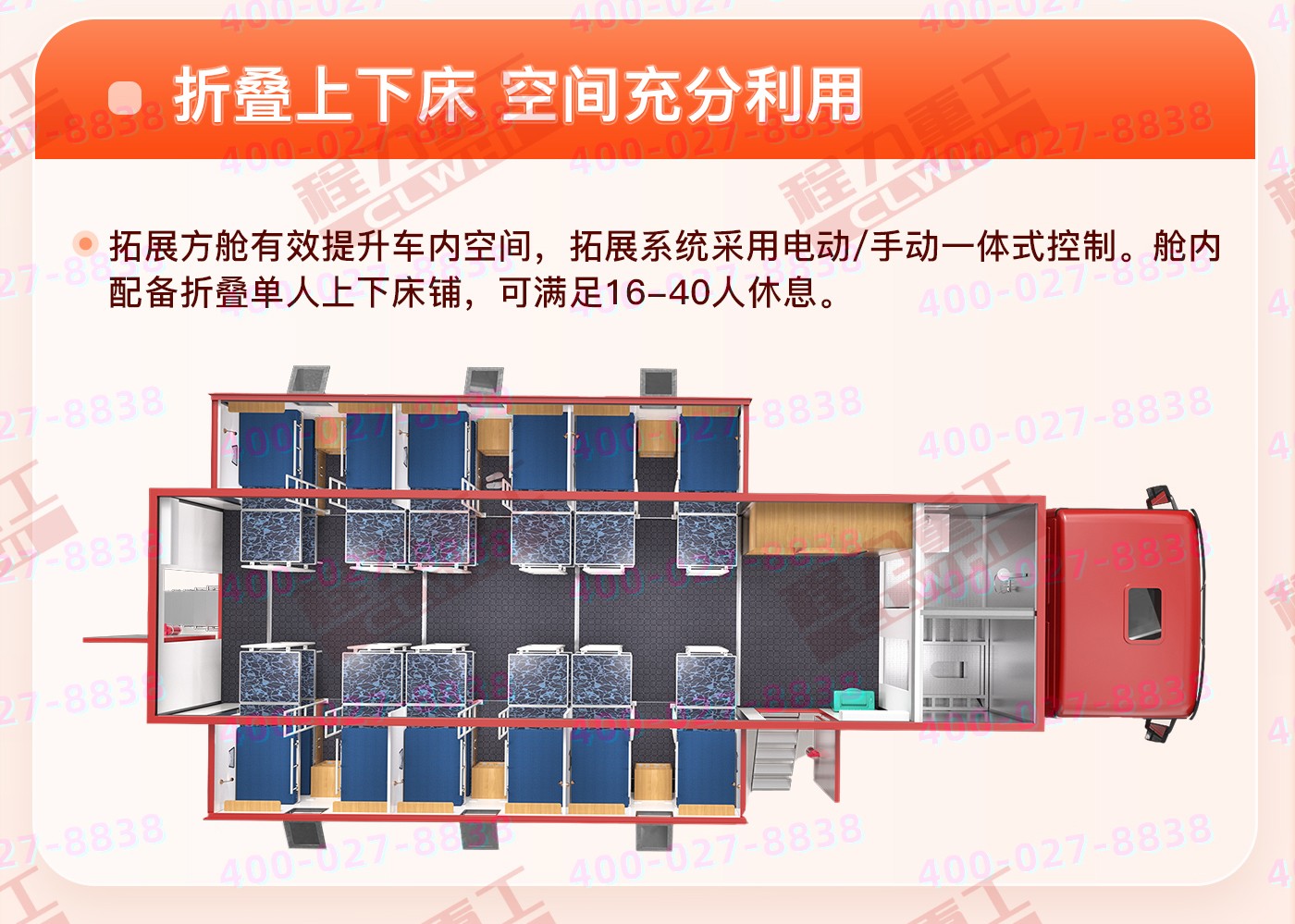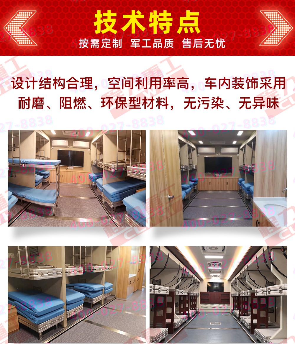 主要專用裝置發電機,折疊床鋪等,選裝配置衛浴間、凈水箱、外掛式空調、衛星天線、吸頂電視、換氣扇、車廂左、右可選裝擴展機構箱體、車廂左、右兩側、后部增加或封閉窗戶、車門、車輛顏色可選裝裝有具有衛星定位的行車記錄儀等,不擴展可供8-12住宿,擴展后可供20-24人住宿。(可根據客戶要求改裝)